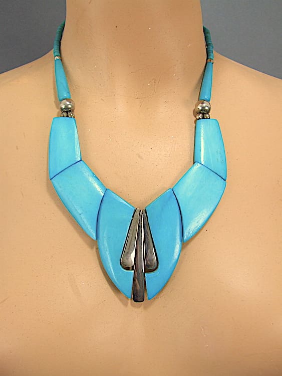 French phenolic or possibly wood vivid turquoise blue and chromed metal necklace.