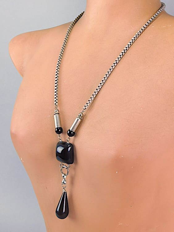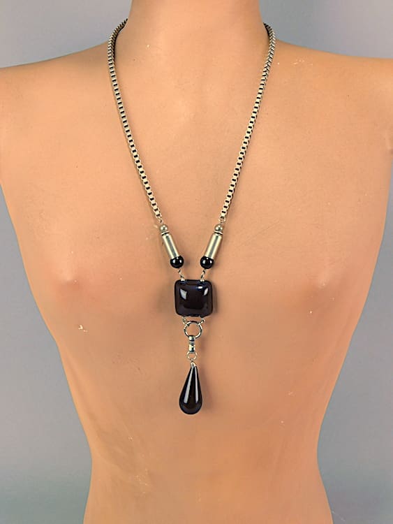 Black galalith and chunky square chrome pendant necklace. Made in the early 1930’s by Jakob Bengel.