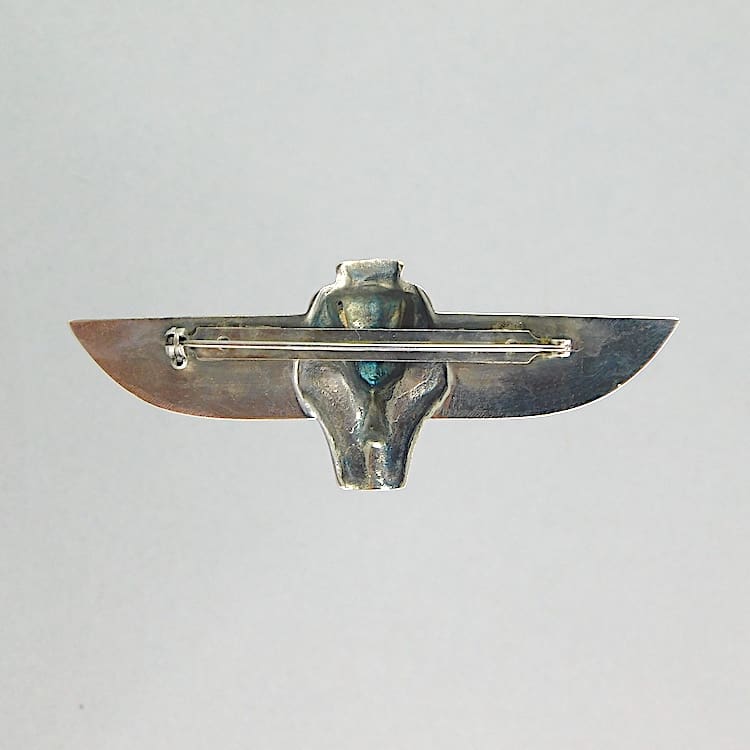 French black and blue enamel winged sphinx head brooch in silver. Fitted with a roll safety clasp.