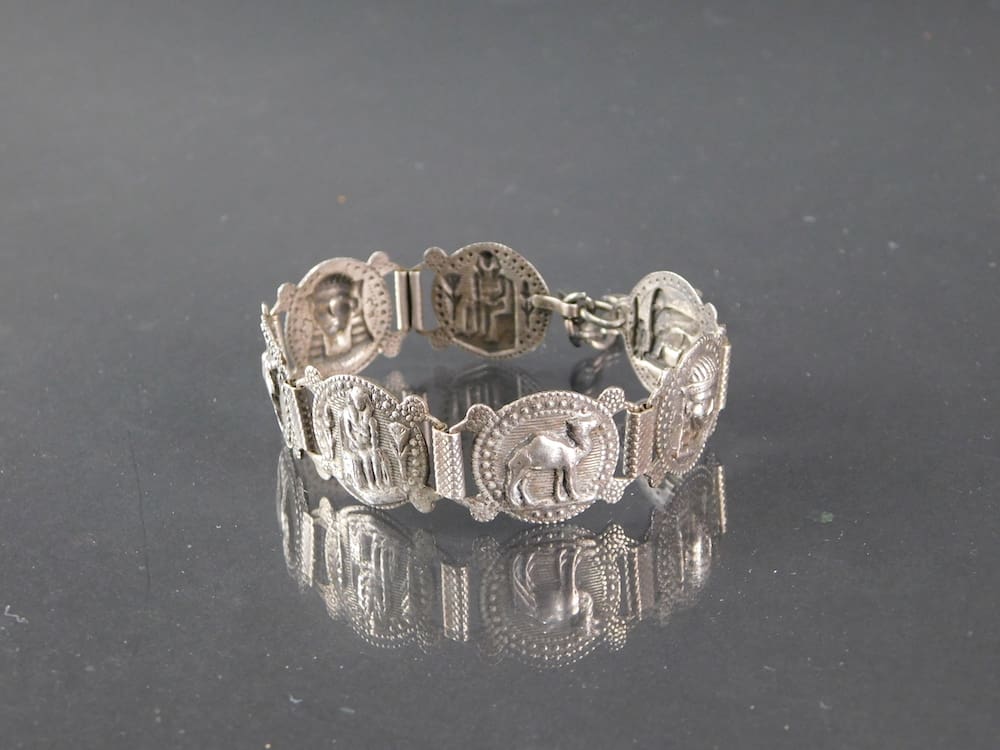 Another 1930s silver metal medallion bracelet with camels, Pharoahs and Gods medallion detail.