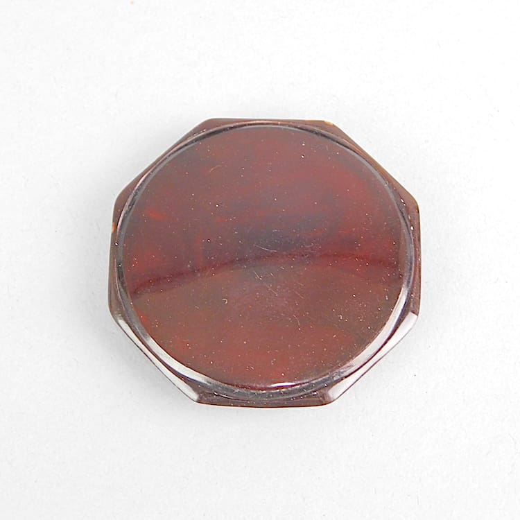 French 1930s Egyptian goddess phenolic tortoise shell effect powder compact. I believe made by Oyonnax of Paris. Inside is mirror and its original unused phenolic powder mesh.