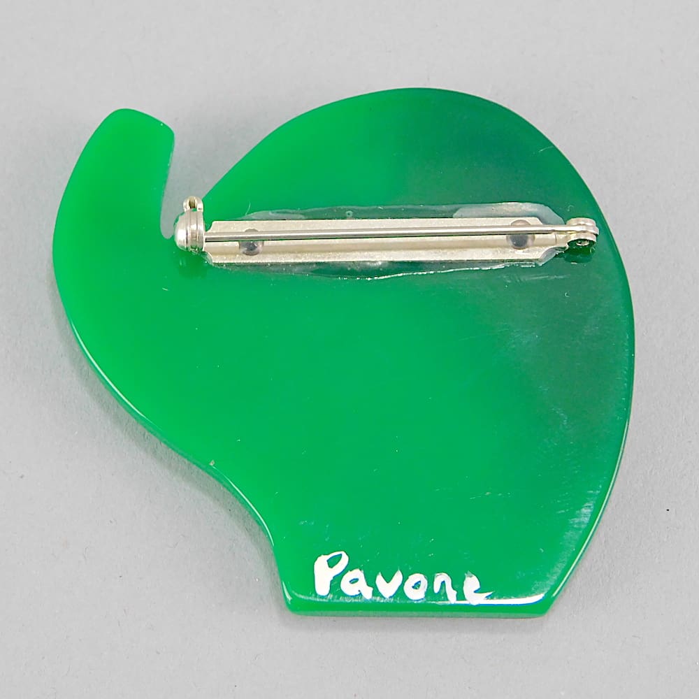 Vintage French galalith elephant brooch, hand painted, signed to the back – Pavone and fitted with a roll safety clasp.