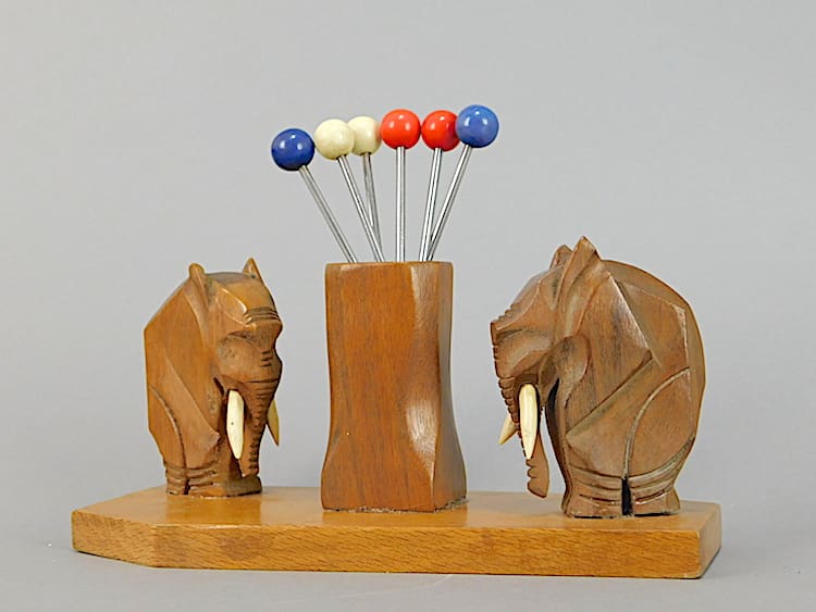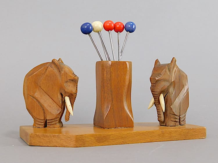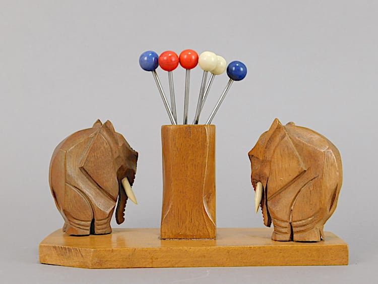 French art deco hand carved cubist elephant cocktail sticks set. Holder with 6 phenolic handles cocktail sticks.