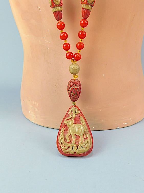 1920’s flapper bead necklace by Ebena of Belgium. Red and beige bakelite beads with oriental patterning and to the bottom is an elephant pendant.