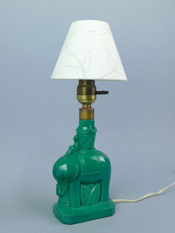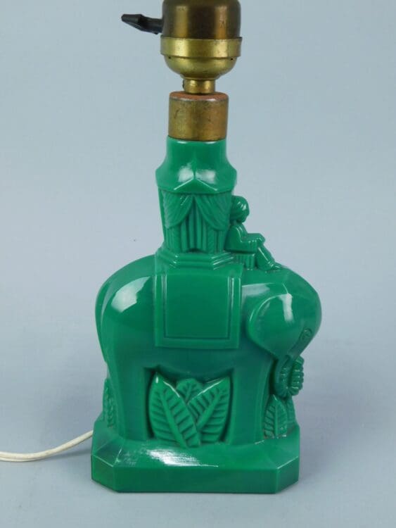 Very stylish green glass table lamp, probably by Robj, marked to the base ‘Made in France’ with a clip on shade. I will leave the buyer to find a nicer shade for it. The current shade clips on to the bulb.