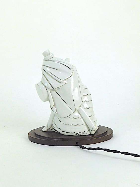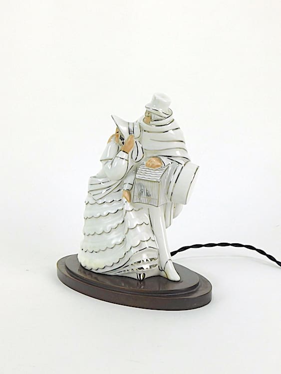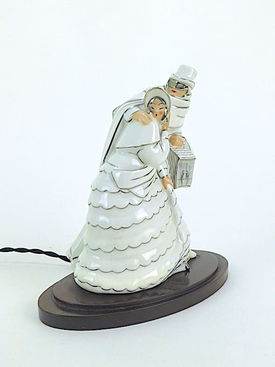 Extremely rare hand painted art deco ceramic night light of a lady and a man with birds in a cage. It is signed to the back of the statue Argilor, Paris. Mounted on an ovular wooden base.