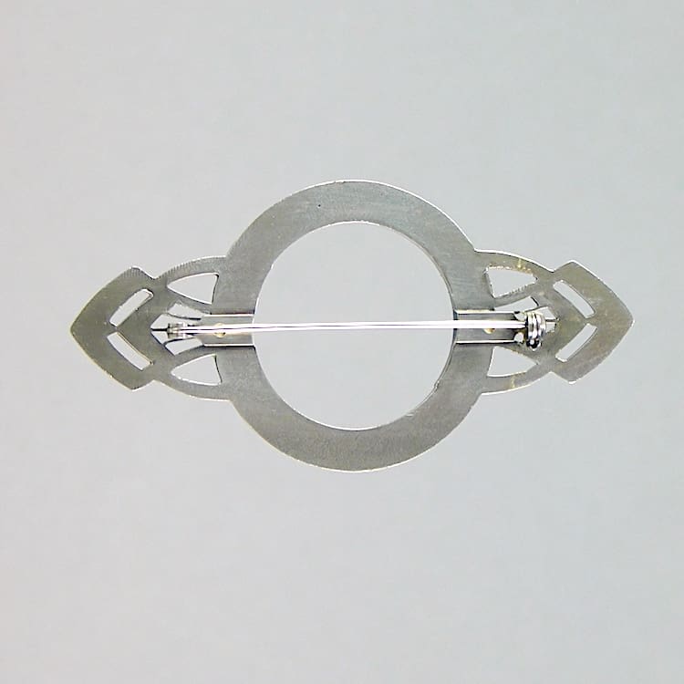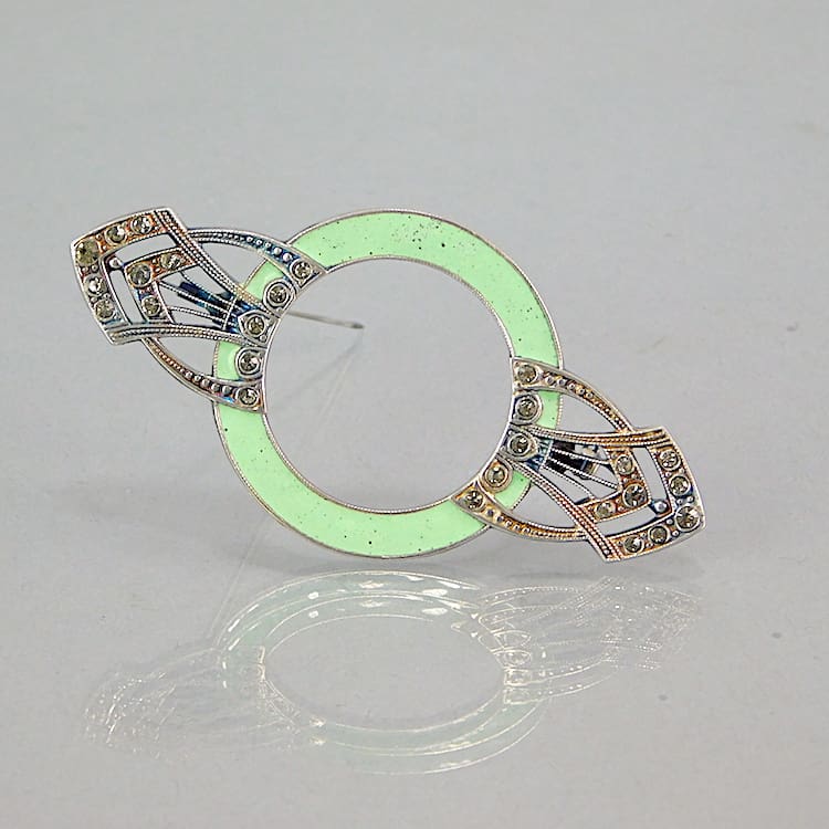 Large French green enamel and silver brooch with diamonte patterning. Fitted with a roll safety clasp.