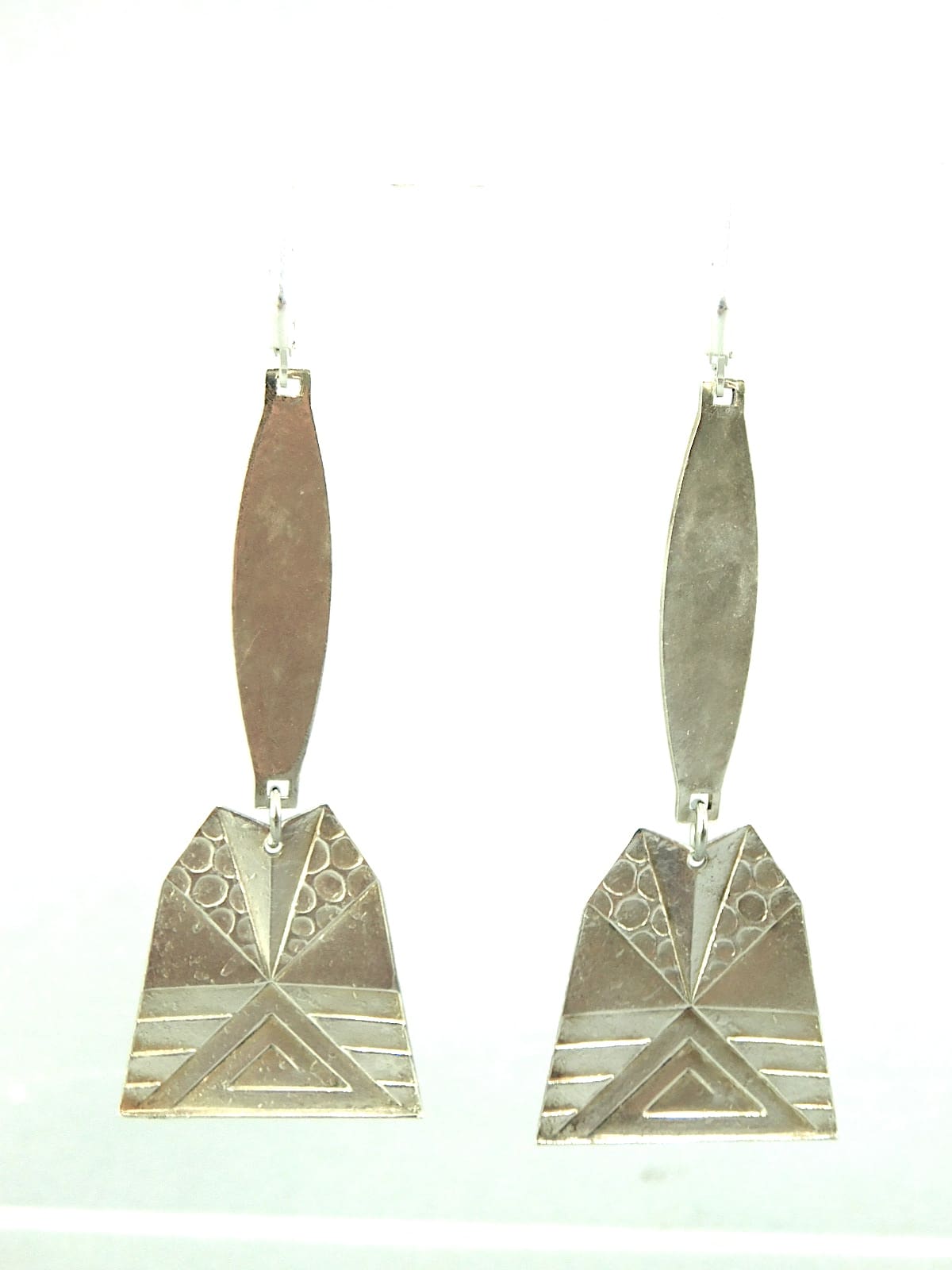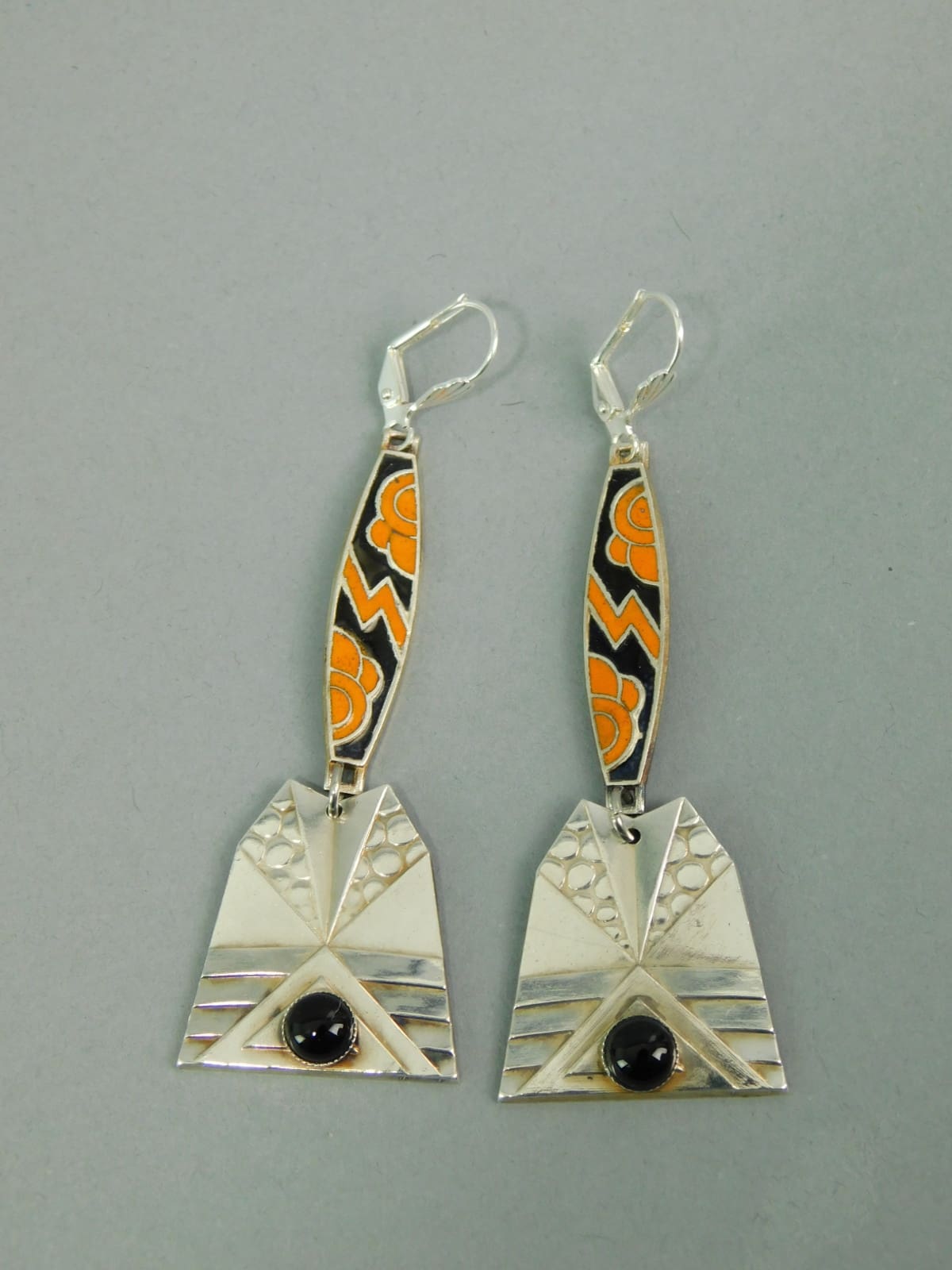 French black and orange enamel silver earrings with black onyx stone. Made for pierced ears with silver safety hooks.