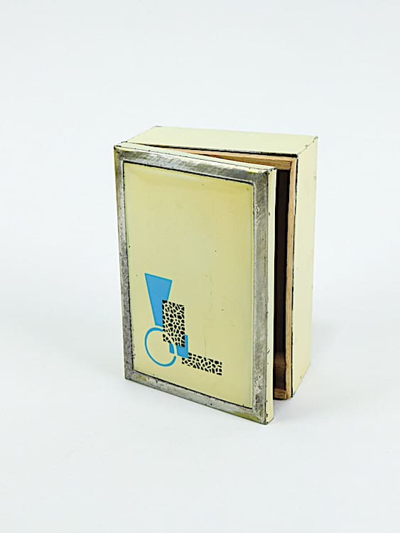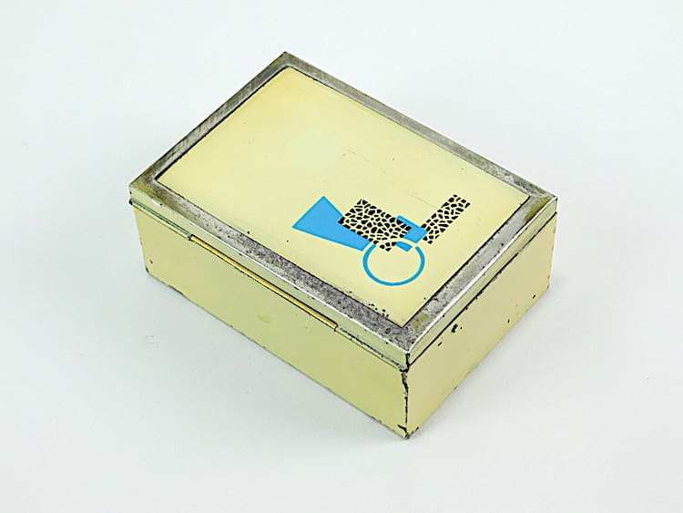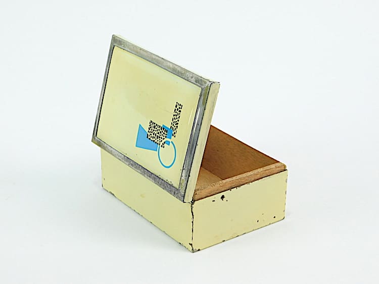 English enamel box – cream with blue and black enamel deco logo with a cedar lining.