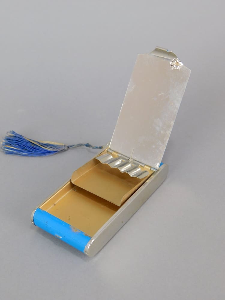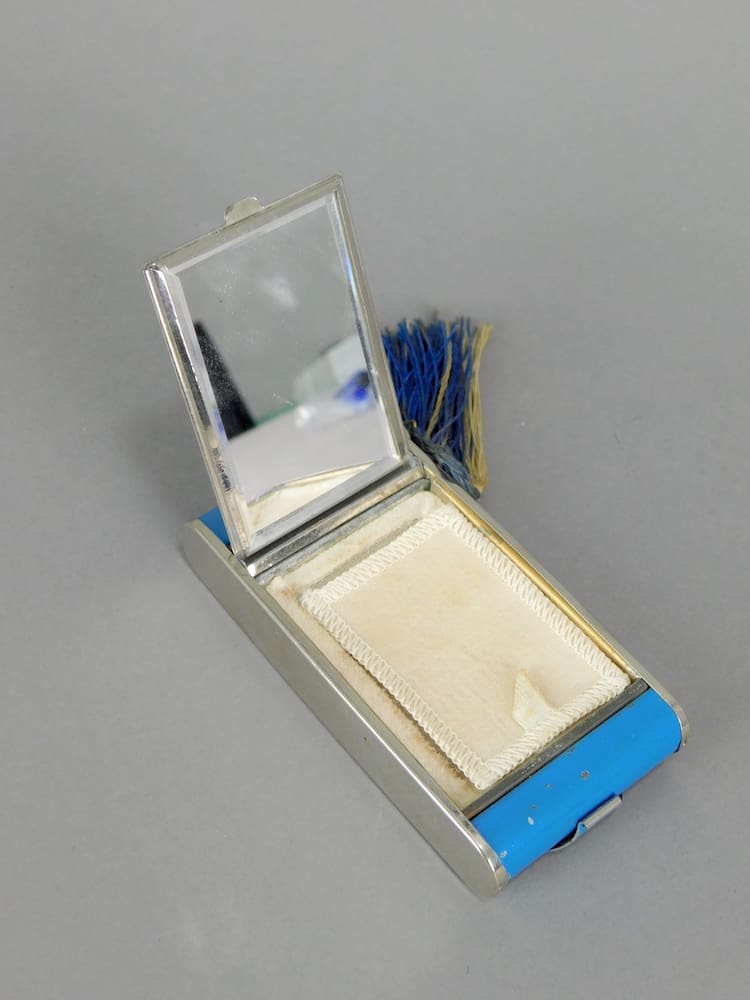 Multi section blue enamel and grey camera compact. With section for powder and mirror to the front, with mesh and puff (unused). There is a cigarette section to the back and a lipstick holder with tassel to one end.