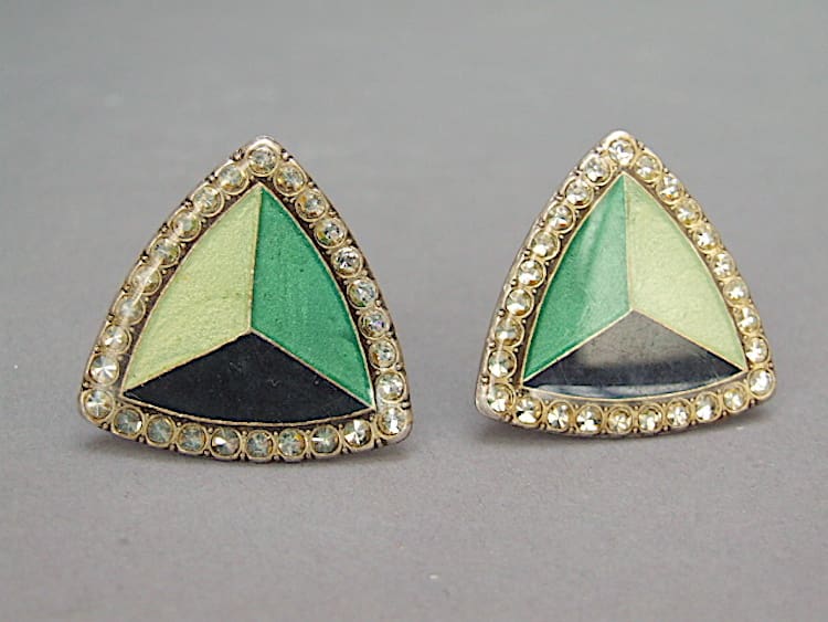 Pierre Bex style enamel and diamonte cufflinks. Possibly converted from earrings, they have green and black enamelling.