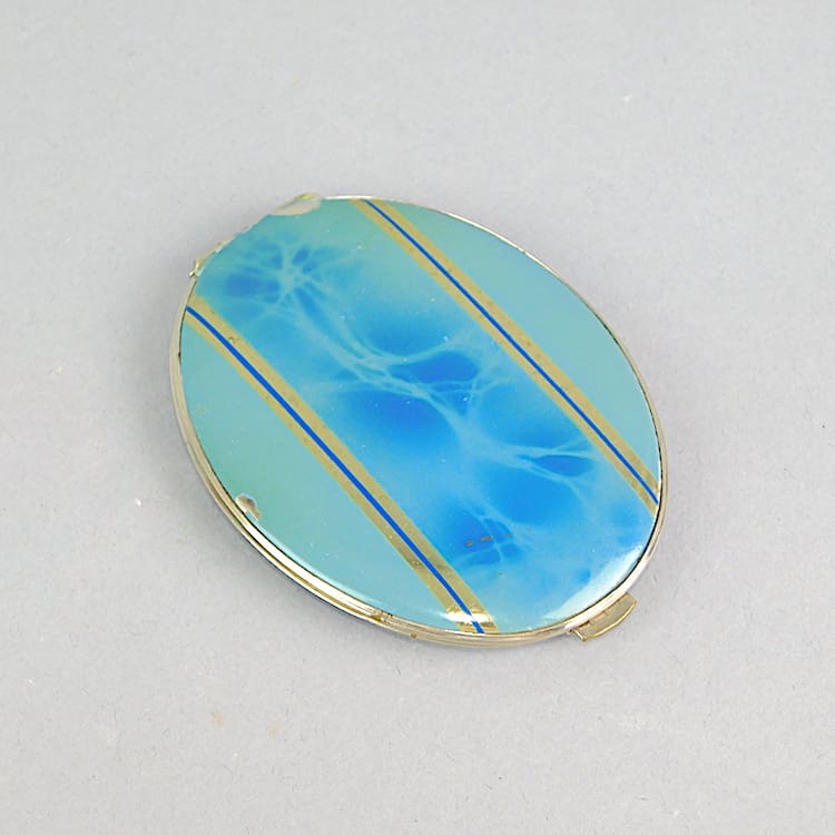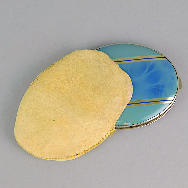 Blue enamel compact. In side is mirror to the lid, and unused puff and mesh. The compact comes with its original suede case and does not look like it has ever been used.