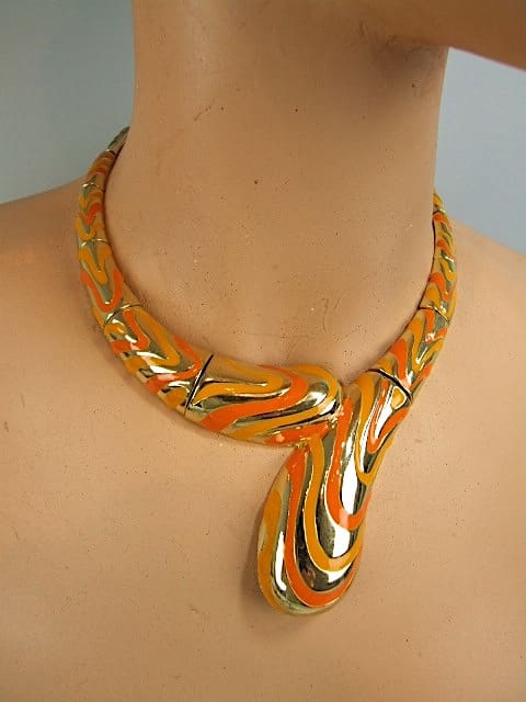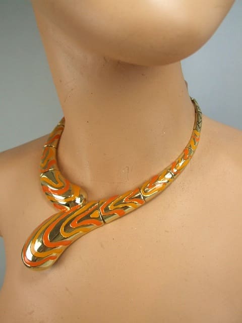 A modern gilt metal and orange enamel necklace in the form of a snake.