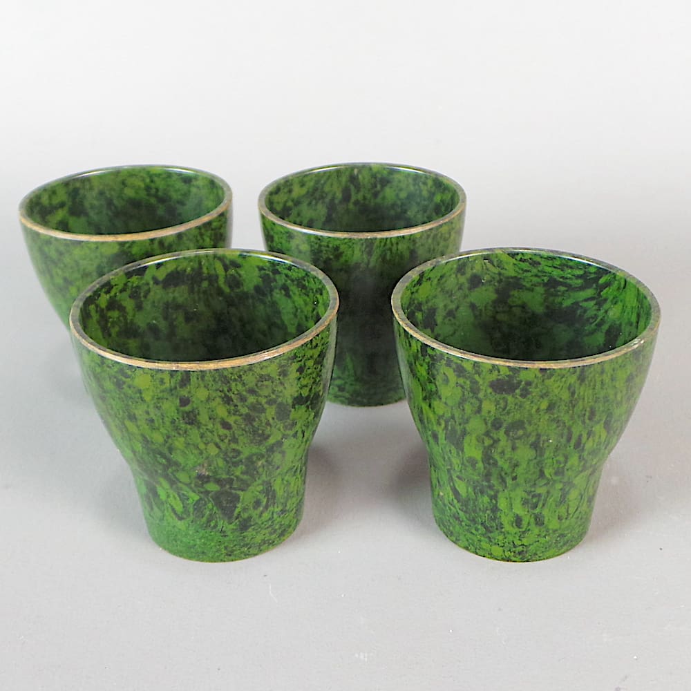Two sets of four English coloured bakelite egg cups.