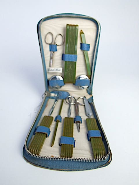 British green phenolic full (10 piece) manicure set, in its original blue leather and zip-around case.
