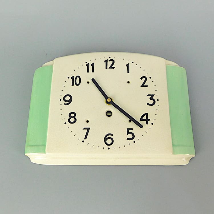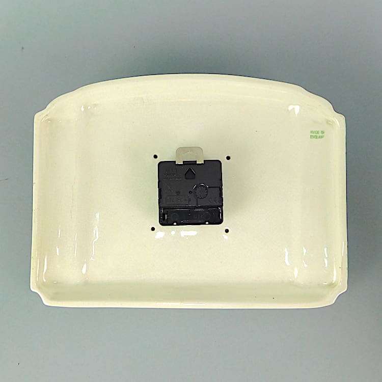 Ceramic wall clock, made in England. Fitted with a recent quartz movement, so no need to keep winding it as it runs on a battery and keeps good time. Perfect as a kitchen clock.