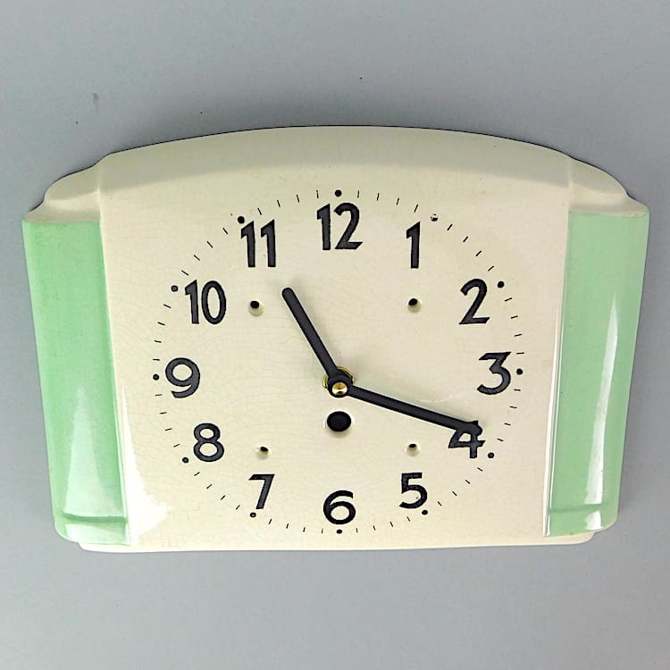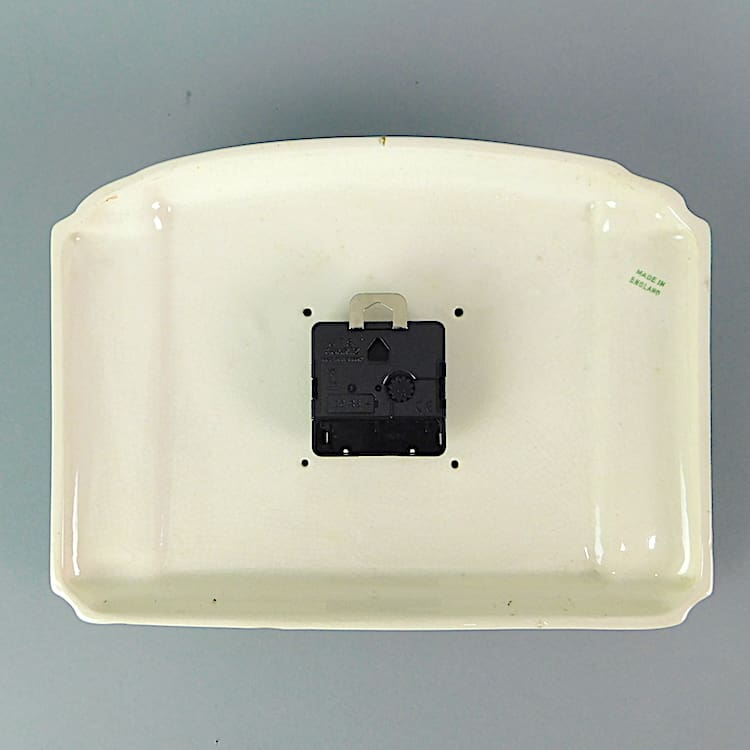 Ceramic wall clock, made in England. Fitted with a recent quartz movement, so no need to keep winding it as it runs on a battery and keeps good time. Perfect as a kitchen clock.