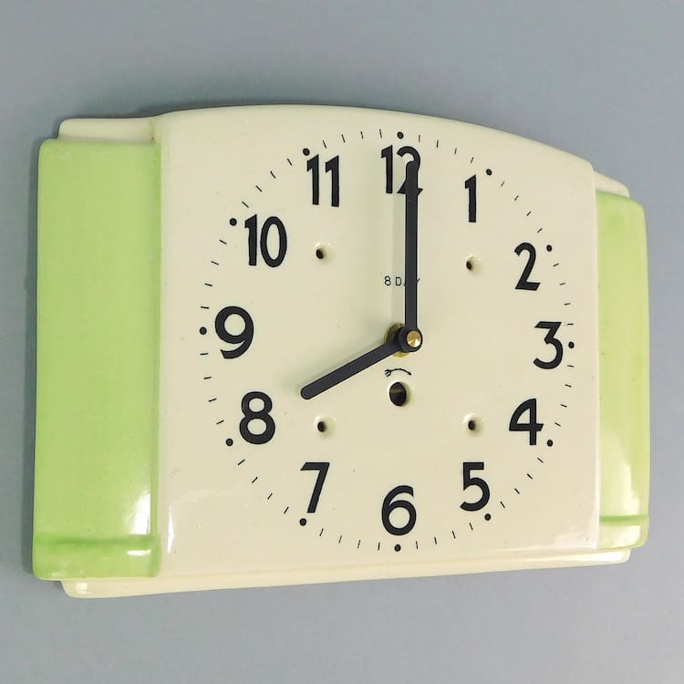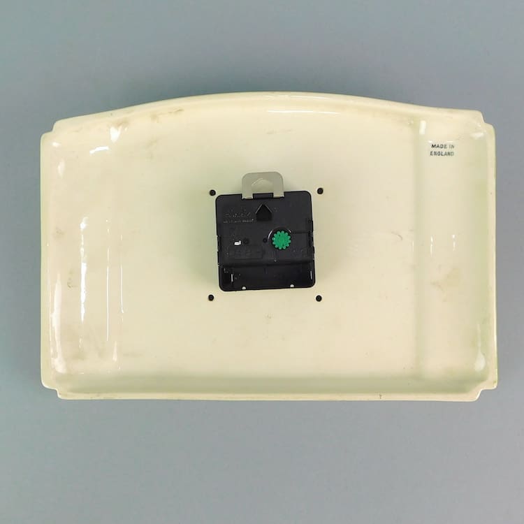 Ceramic wall clock, made in England. Fitted with a recent quartz movement, so no need to keep winding it as it runs on a battery and keeps good time. Perfect as a kitchen clock.