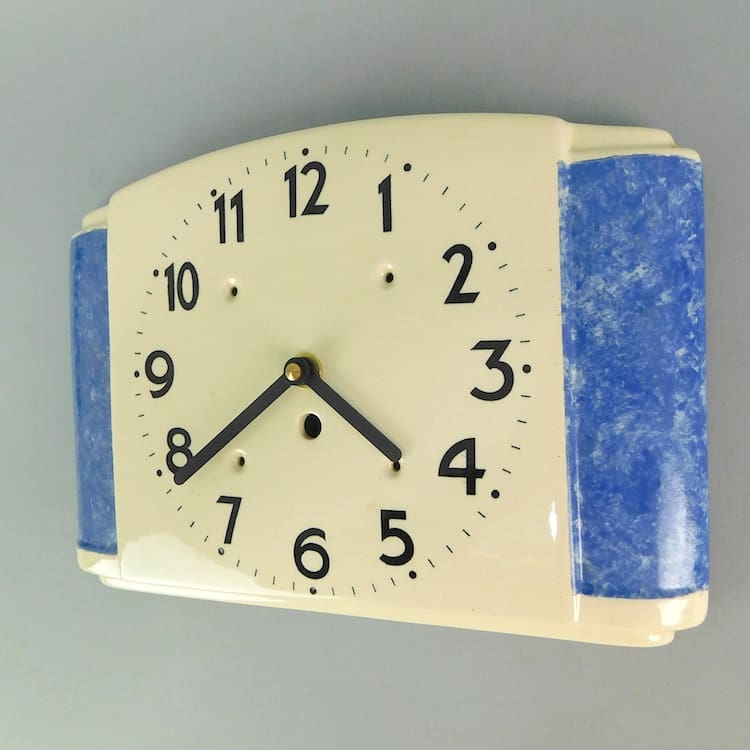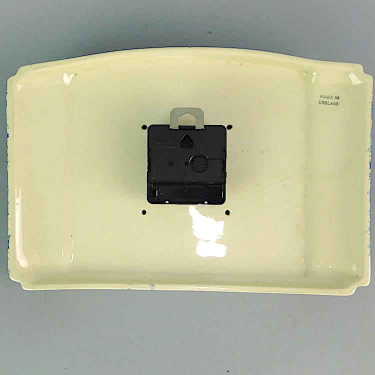 Ceramic wall clock, made in England. Fitted with a recent quartz movement, so no need to keep winding it as it runs on a battery and keeps good time. Perfect as a kitchen clock.
