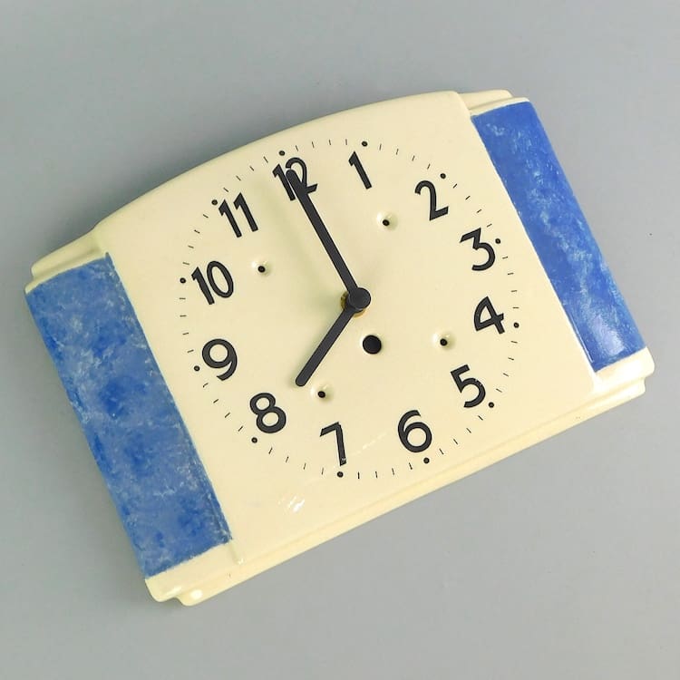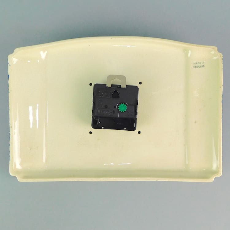 Ceramic wall clock, made in England. Fitted with a recent quartz movement, so no need to keep winding it as it runs on a battery and keeps good time. Perfect as a kitchen clock.