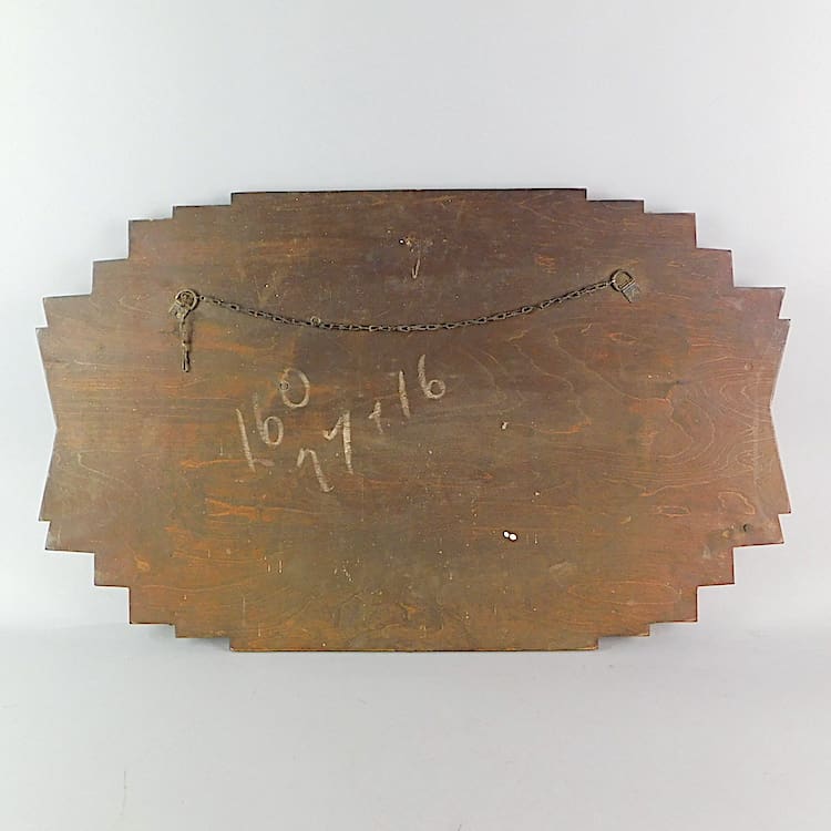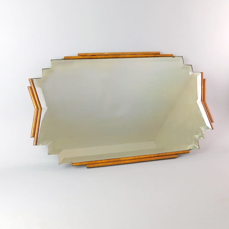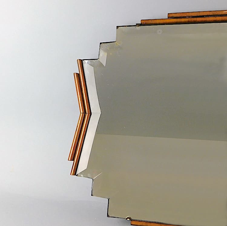 English art deco wall mirror with walnut side panels and stepped detailing. Original glass with bevel edges.