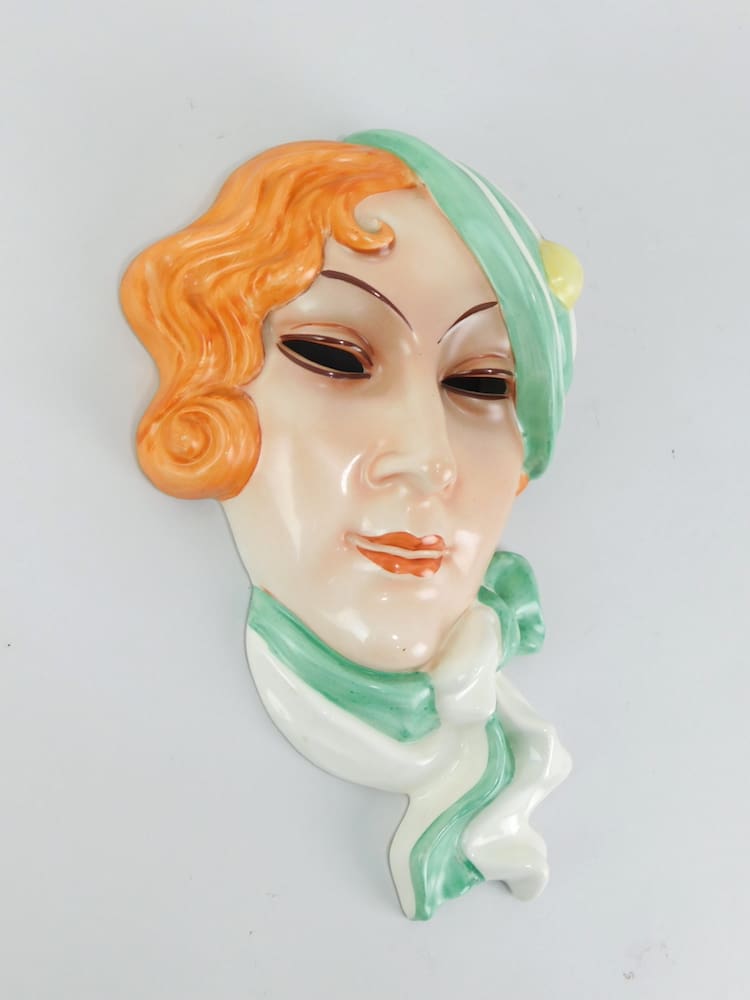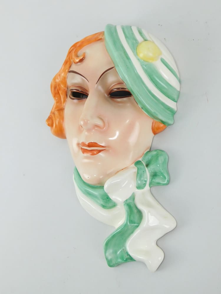 This wall mask is a Czechoslovakian mask, beautifully hand painted in vivid deco colours.
