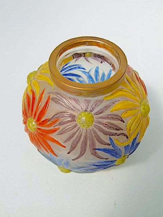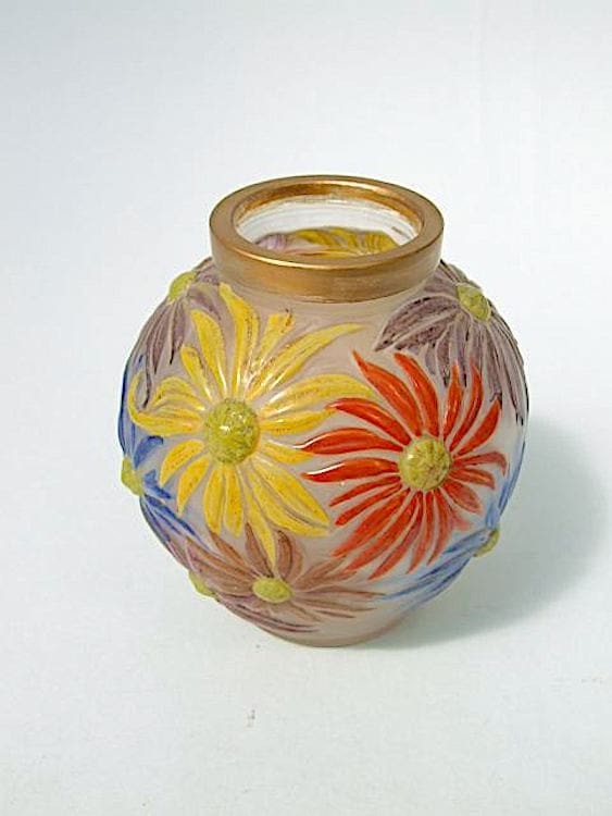Lovely French glass vase by the Etling foundry of Paris and signed to the bottom and is beautifully hand painted in vivid blue, yellow, orange and purple enamel painted floral detail.