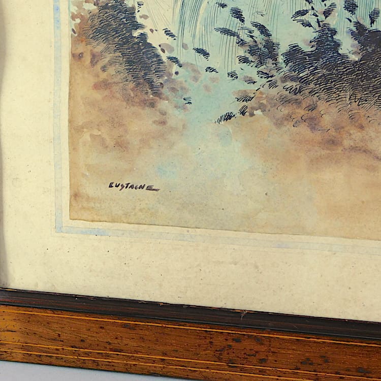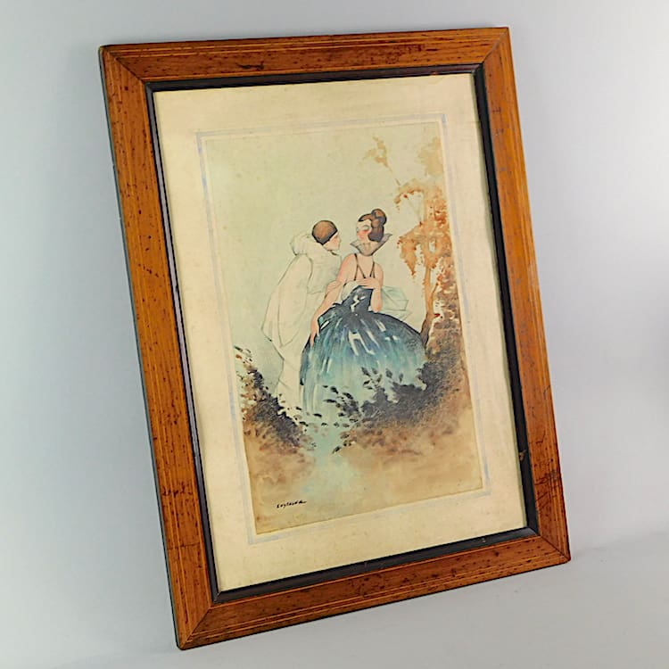 A signed French Art Deco pen and ink drawing with water colour detailing. A pierrot and lady, signed by the artist Eustache. Mounted in its original 1920s wooden frame.
