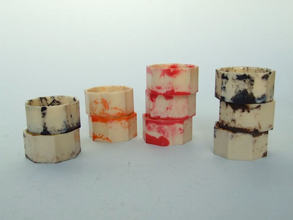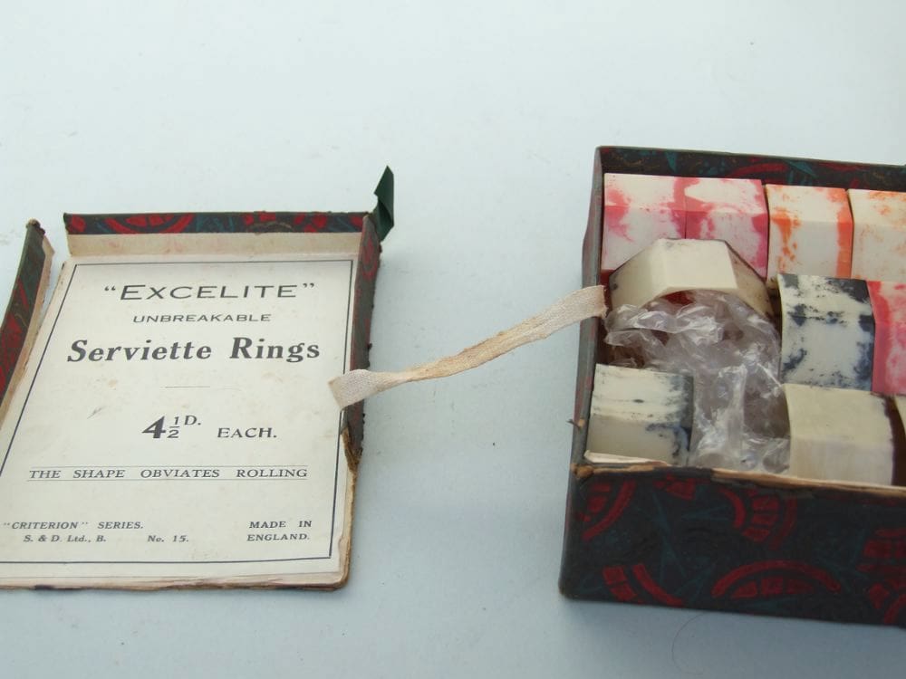 A boxed set of unbreakable marbled phenolic plastic serviette rings – 10 in their original box.