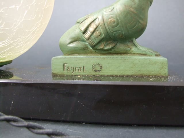 Signed to the metal socle base Fayral and bearing the Le Verrier foundry stamp.
