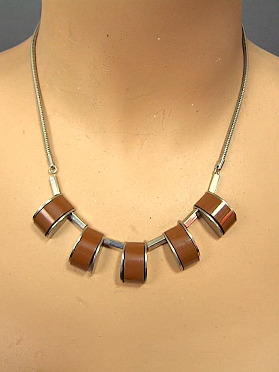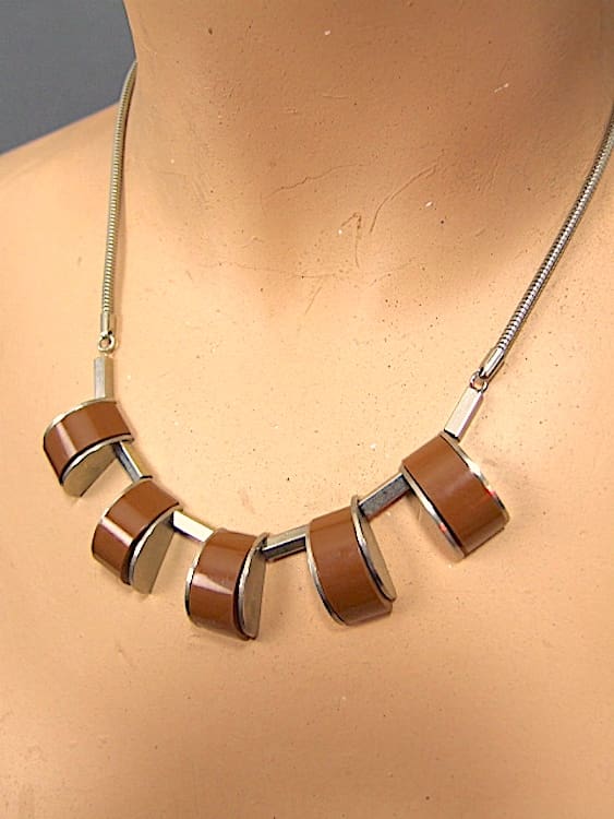Early 1930s brown galalith fan necklace by Jakob Bengel.