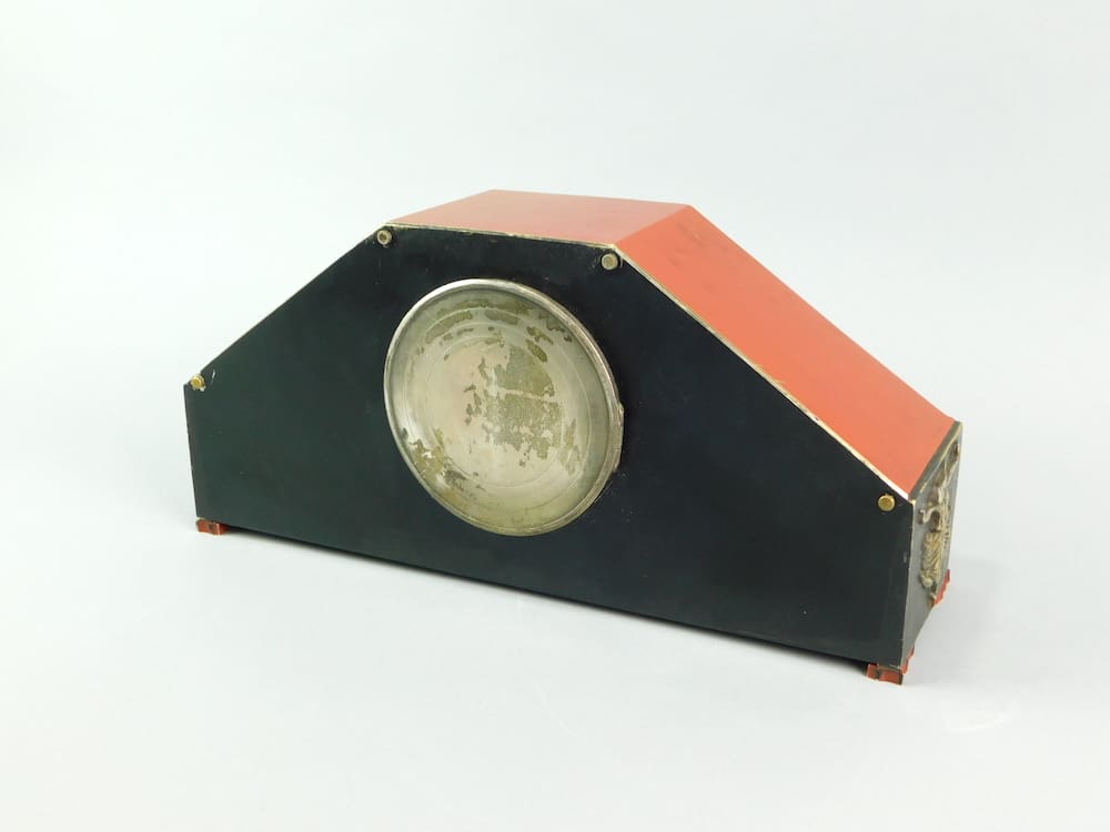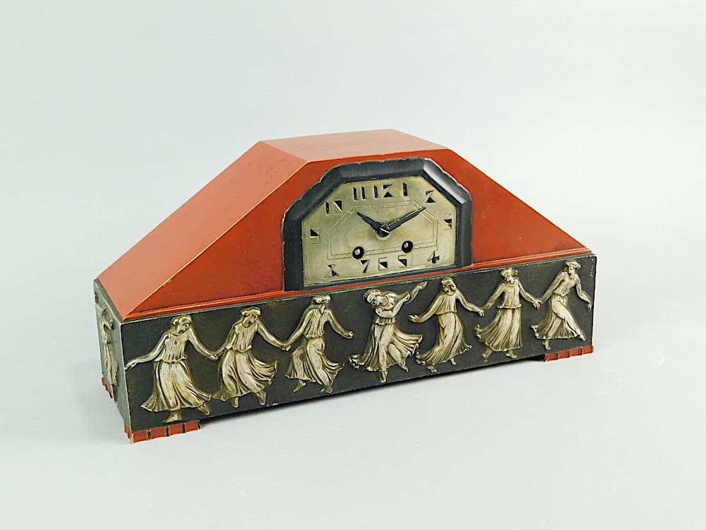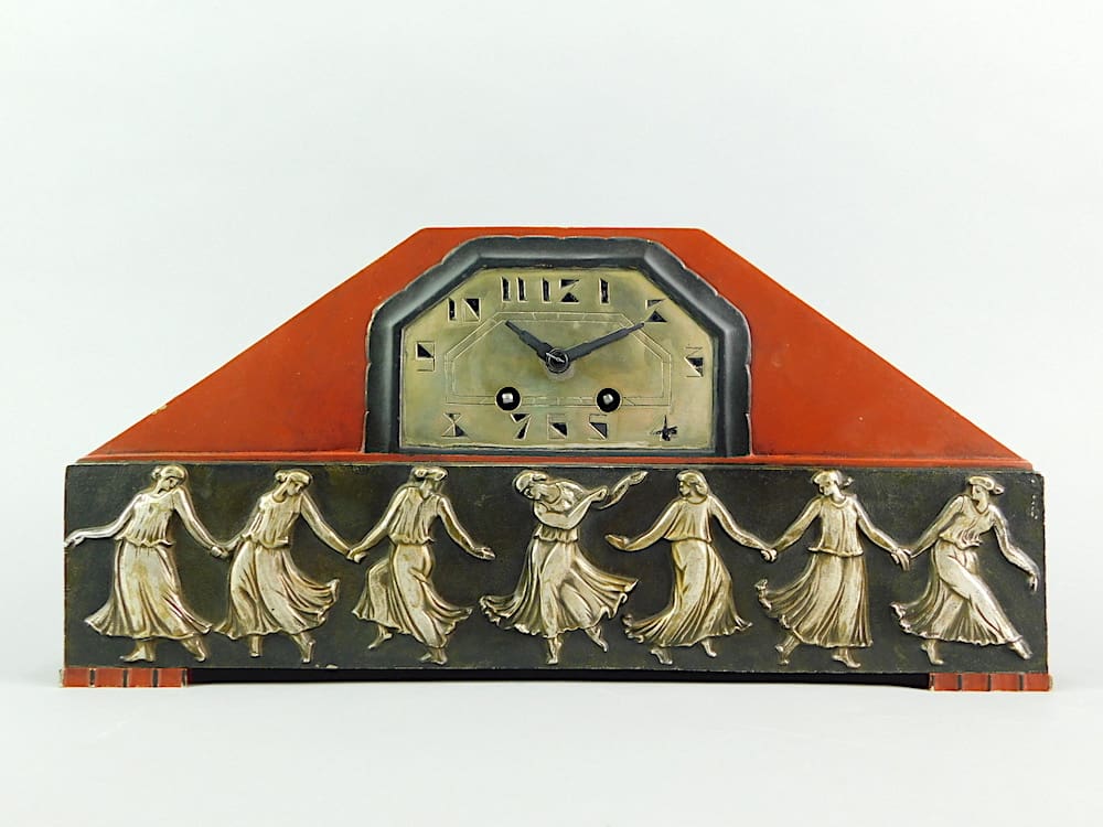 French art deco bronze clock. There are 9 silvered bronze dancers around the front and sides. The top is enamelled bronze which match the feet. The face of the clock is silvered bronze with art deco numerals.