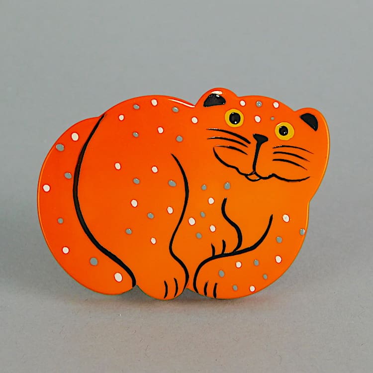 French vintage galalith hand made and painted cat brooch by Marie-Christine Pavone. Hand signed to the reverse and fitted with a roll safety clasp.