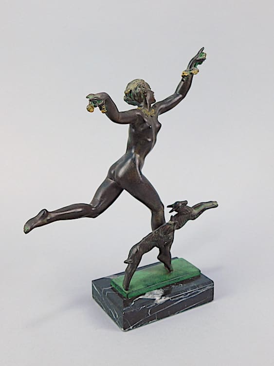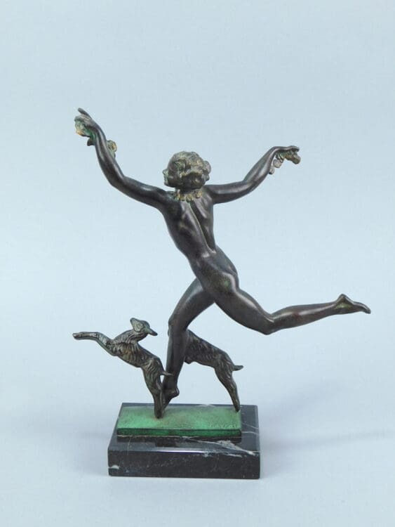 A popular green patinated art metal figure, made by the Le Verrier foundry in Paris, signed to the metal base Fayral and bearing the foundry stamp. Fayral was a pseudonym used by Pierre Le Faguays.