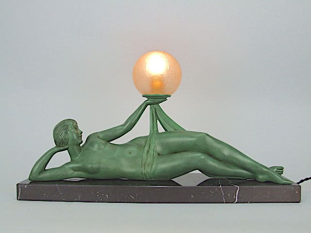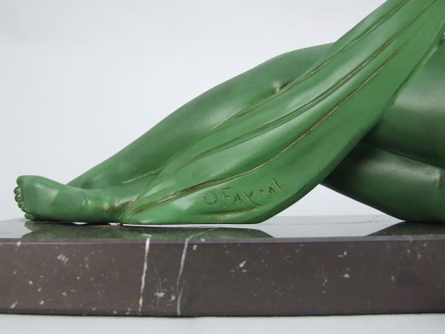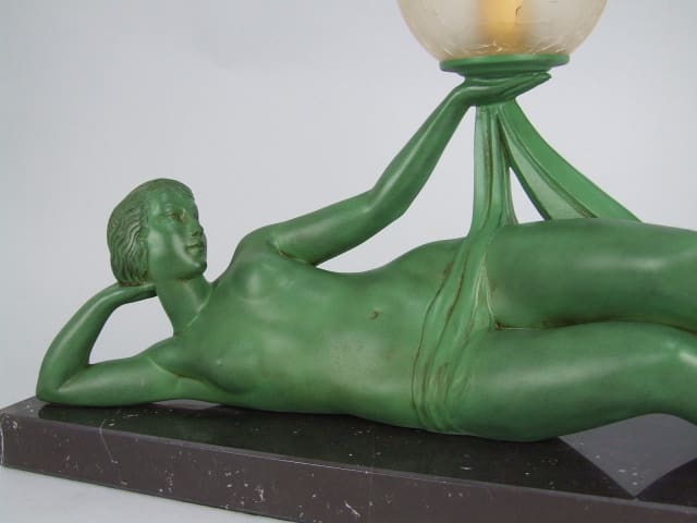 A large green patinated spelter lady lamp signed Fayral. crackle glaze shade. Mounted on a black marble base and rewired.