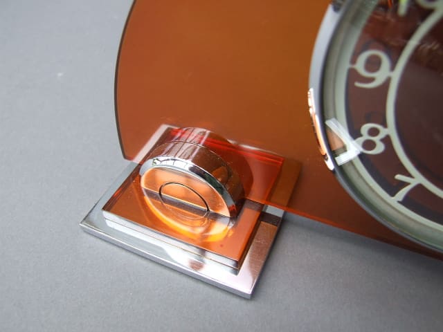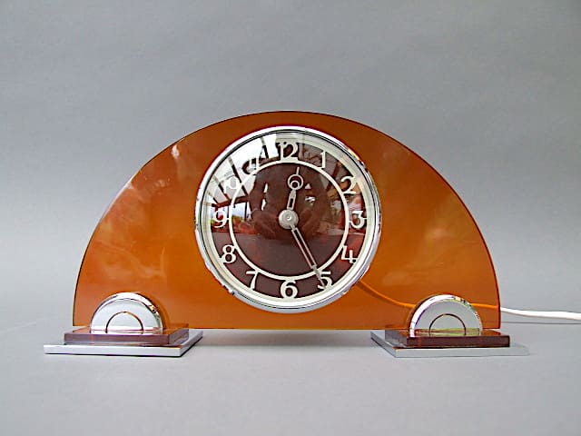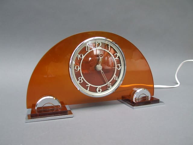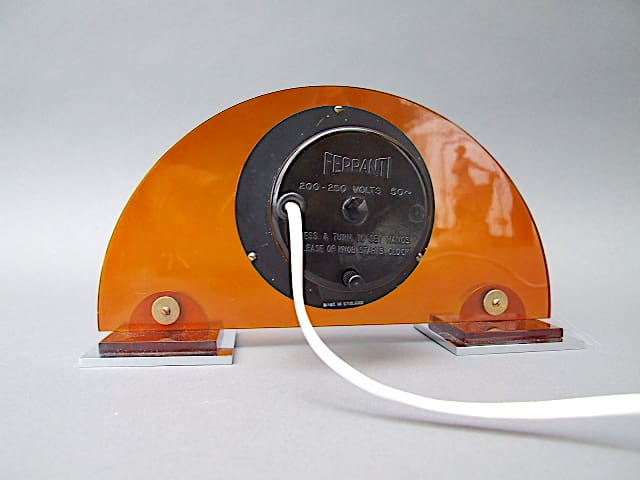 Amber lucite panel electric clock by Ferranti. Chrome face detail and semi circled feet.