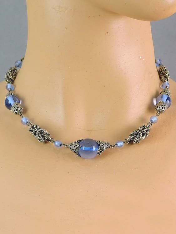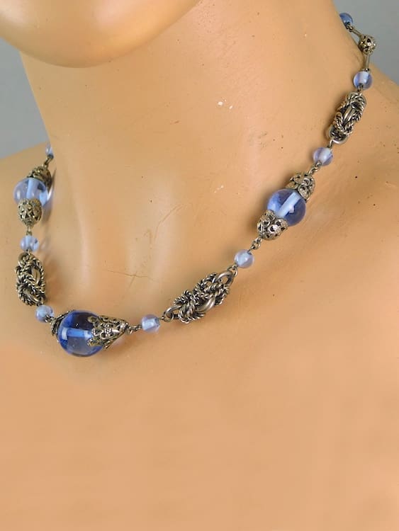 Blue glass and chrome filigree twist art deco necklace. Made by Jakob Bengel in the early 1930s.