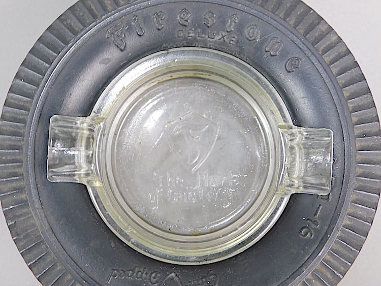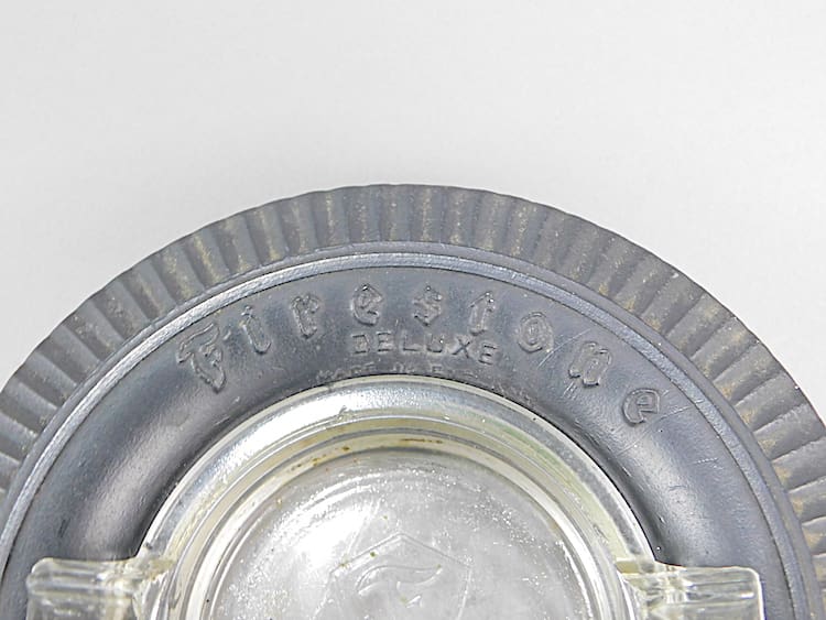 Firestone tyre advertising ashtray, these were made for use in tyre shops and car dealers for on the counter. The tyre on this one reads Firestone Deluxe and the glass ashtray insert reads – the mark of quality.