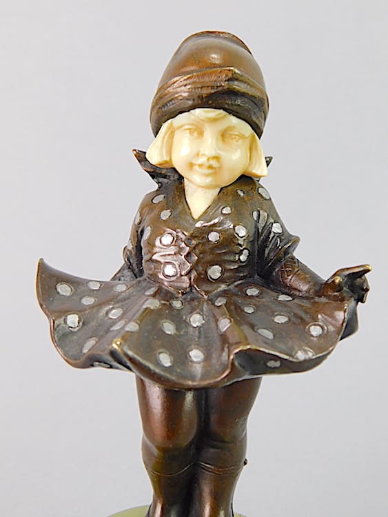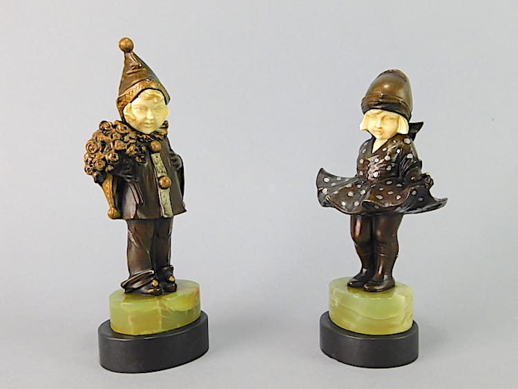 French Art Deco Pierrot and Pierette statues in bronze and ivory – the boy with a bouquet of flowers for the little girl.