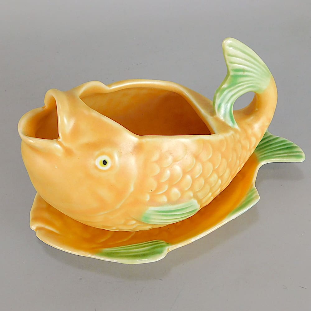 English matt glaze fishes dinner set. Consits of a large server plate, sauce jug and drip plate, 1 Tureen and lid, 6 side plates.