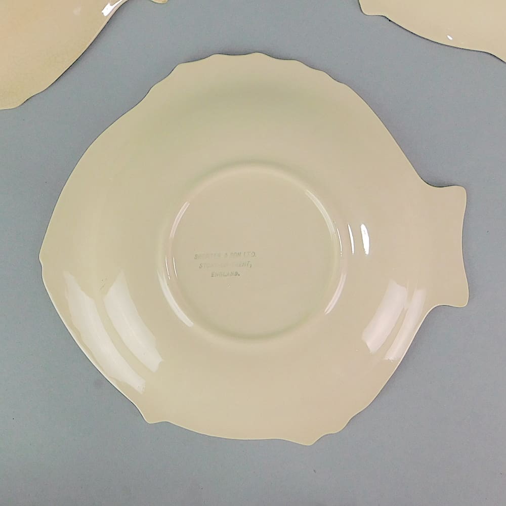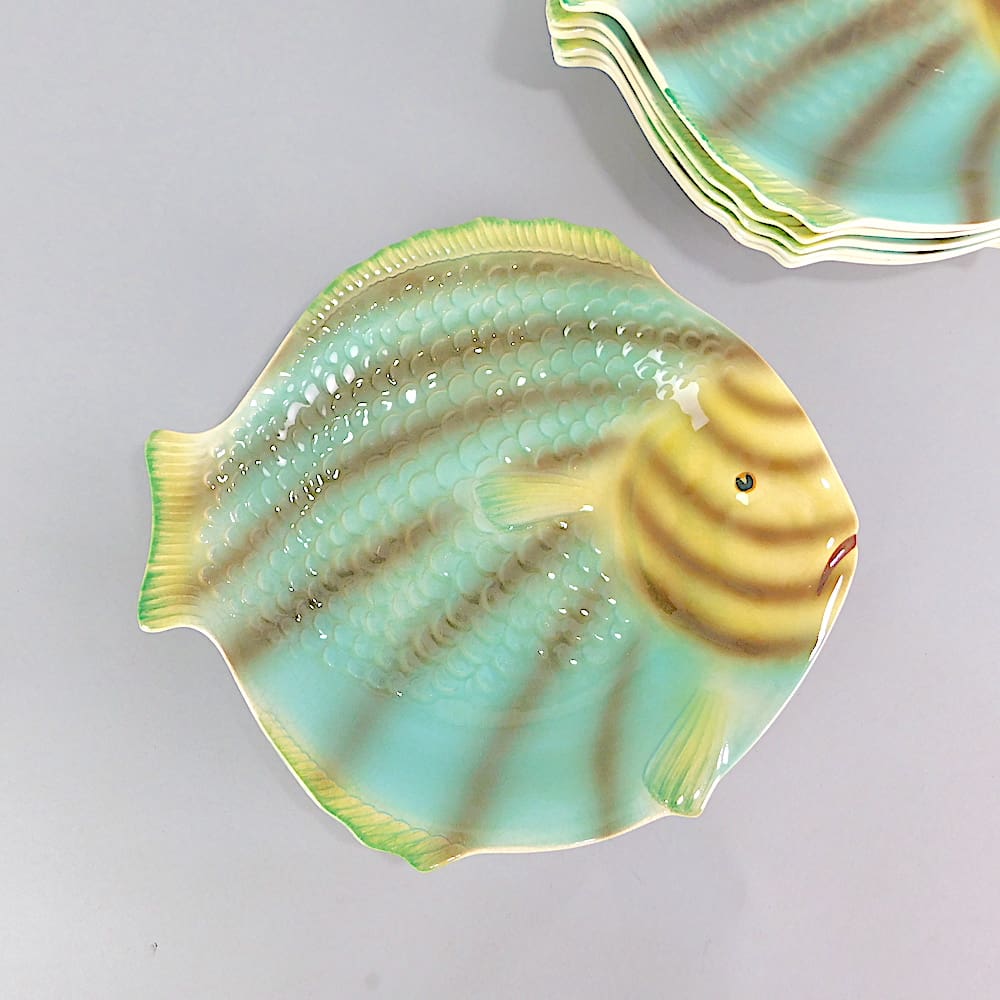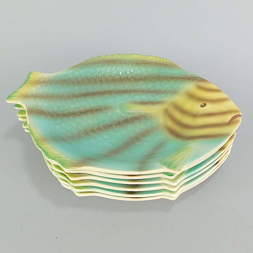 English ceramic 6 fish plates by shorter and son. Unusual striped turquoise and yellow high glaze.