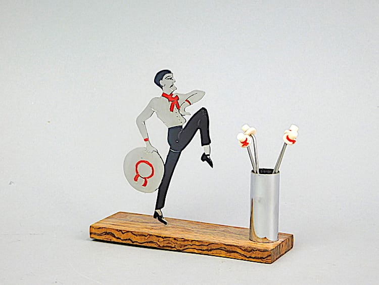 Base is of Zebrano wood and measures 5.5 inches (14cm) long, 2 inches (5cm) deep and the total height is 5 inches (12.5cm.)