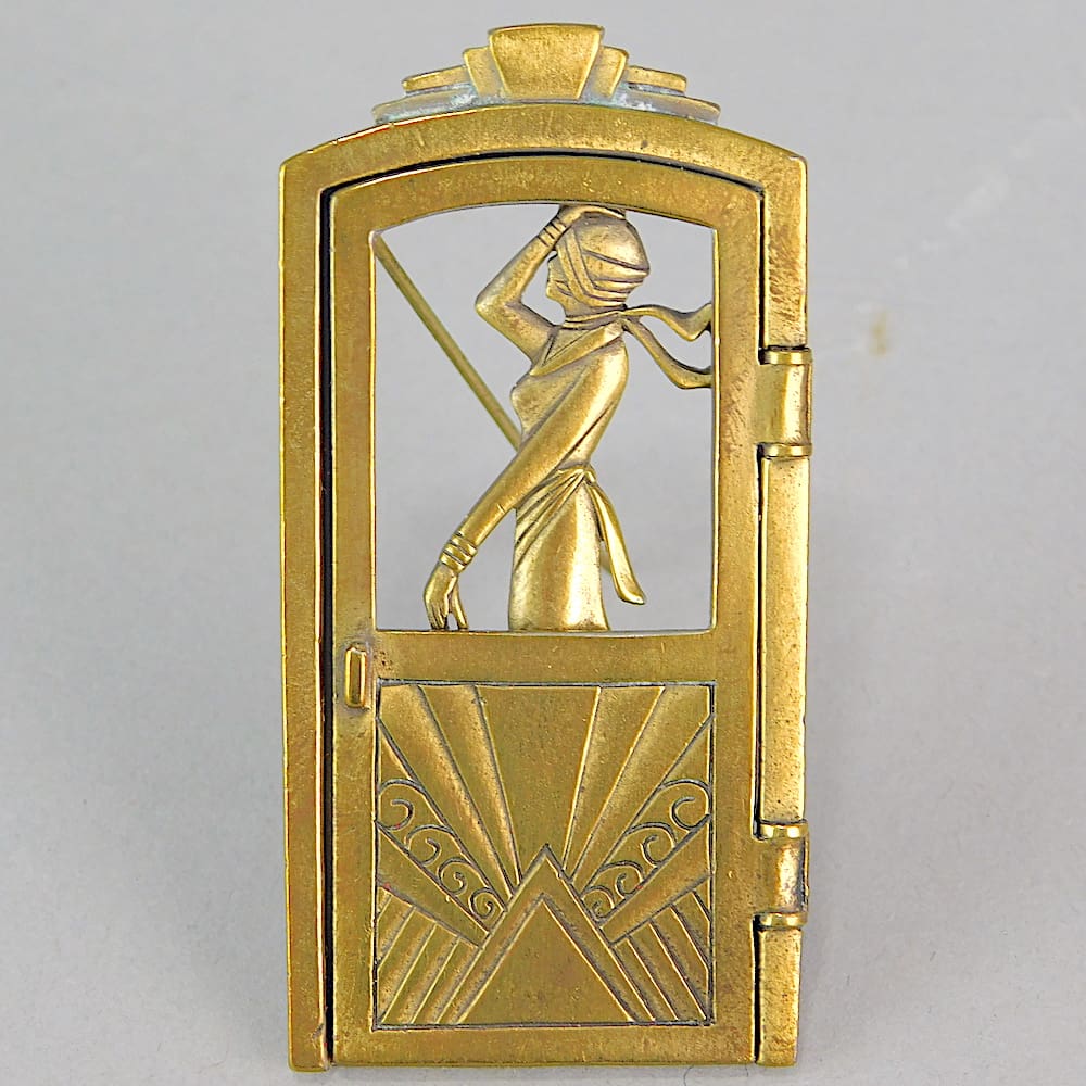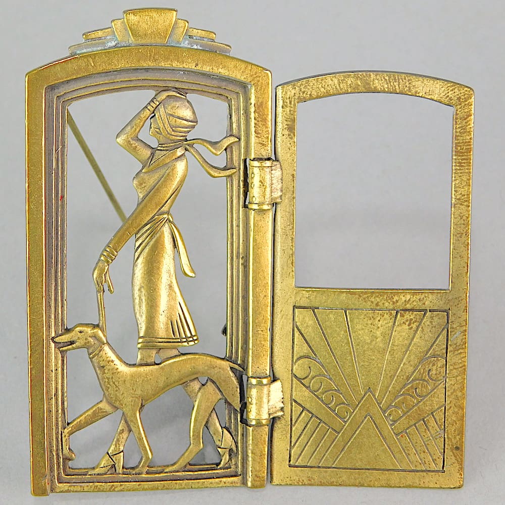 Vintage bronzed metal brooch with unusual opening door detail. Made by the Jonette Jewellery (USA). Fitted with a roll clasp.