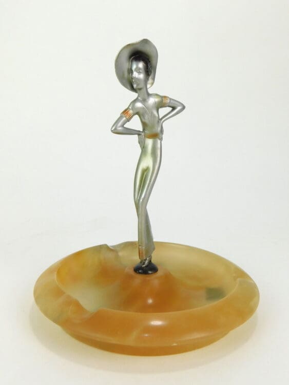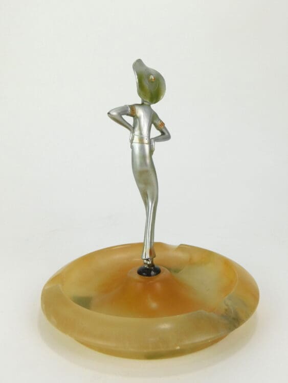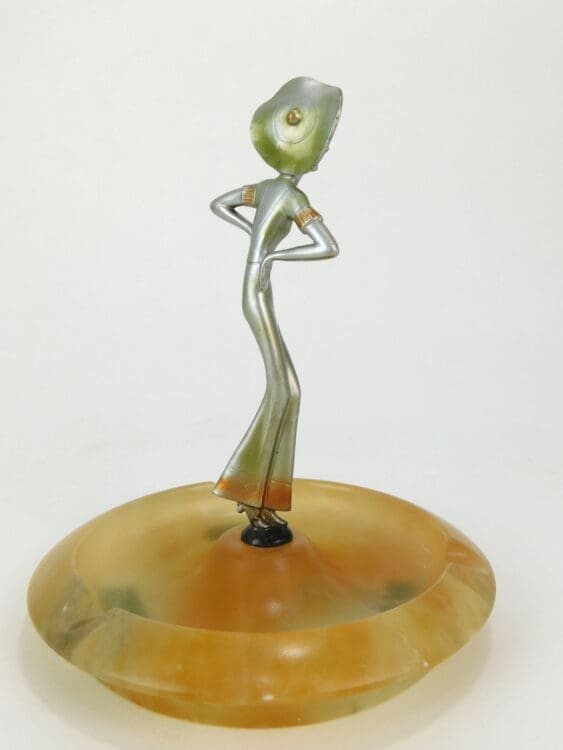 She has a silver and gold enamelled patina, the dish is made of onyx and would originally have been an ashtray.