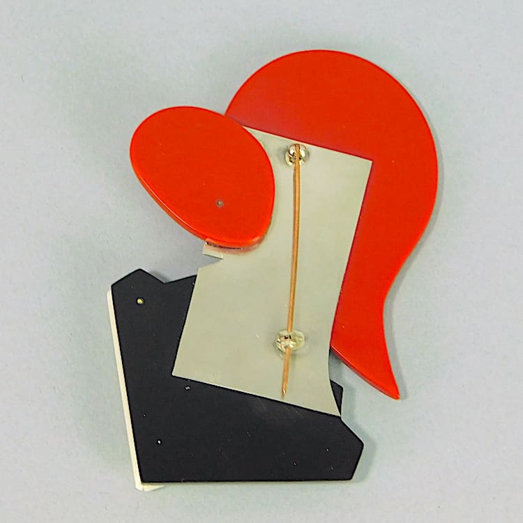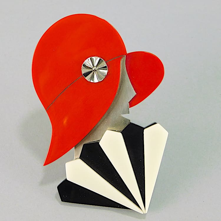 French phenolic and chrome large flapper brooch with fan and cloche hat.