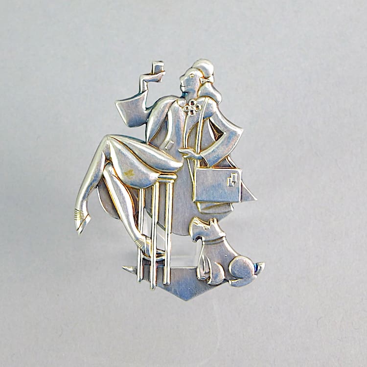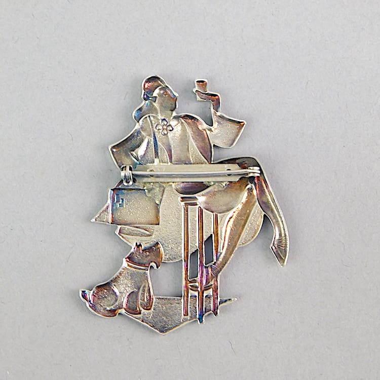 French art deco flapper with dogs at a bar, silver plated brooch. Fitted with a roll safety clasp.