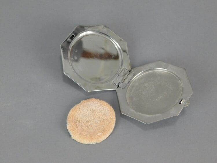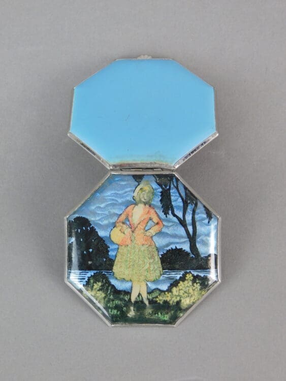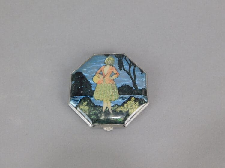 Octagonal foil under celluloid depicting a lady by a lake scene. Inside there is a reflective lid and a puff.