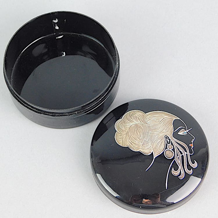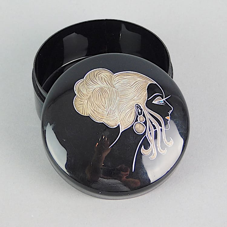 A 1930’s celluloid powder bowl with beautifully hand painted flapper to the lid in black and silver. This is one of a few new/old unsold stock items which were purchased from a Paris shop