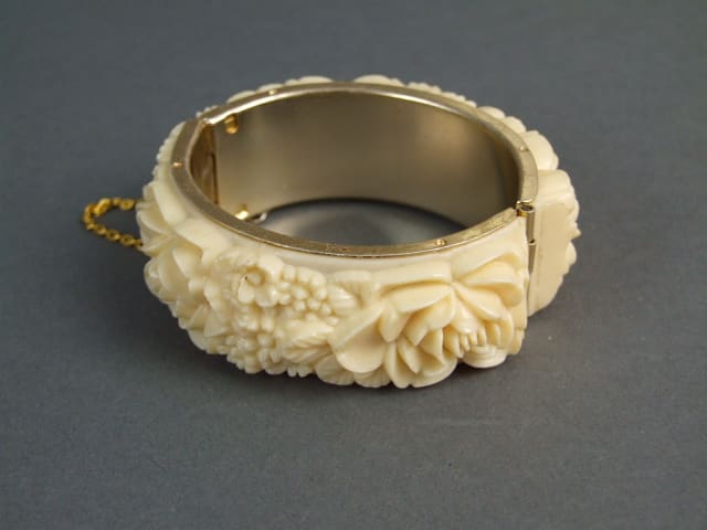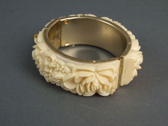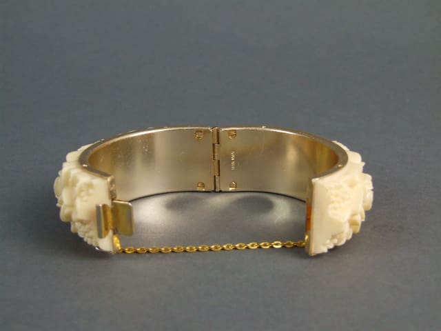 Cream phenolic bangle, made in Hong Kong. It opens to one side and has a gilt safety chain.