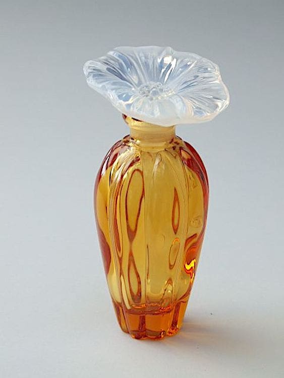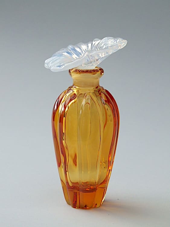 Czech contemporary crystal scent bottle with amber base and vaseline flower stopper.